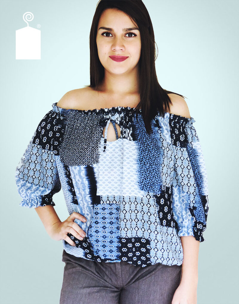 Blusa con cuello y mangas 3/4 en elástico. Lazo y apertura al frente