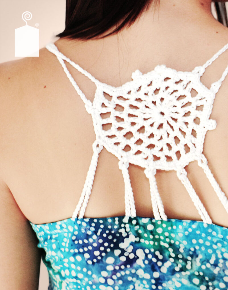 Blusa playera estampada con espiral blanca central en la espalda elaborada a mano en técnica ganchillo.Tiras hacia el frente en ganchillo y ajuste al busto con elástico.