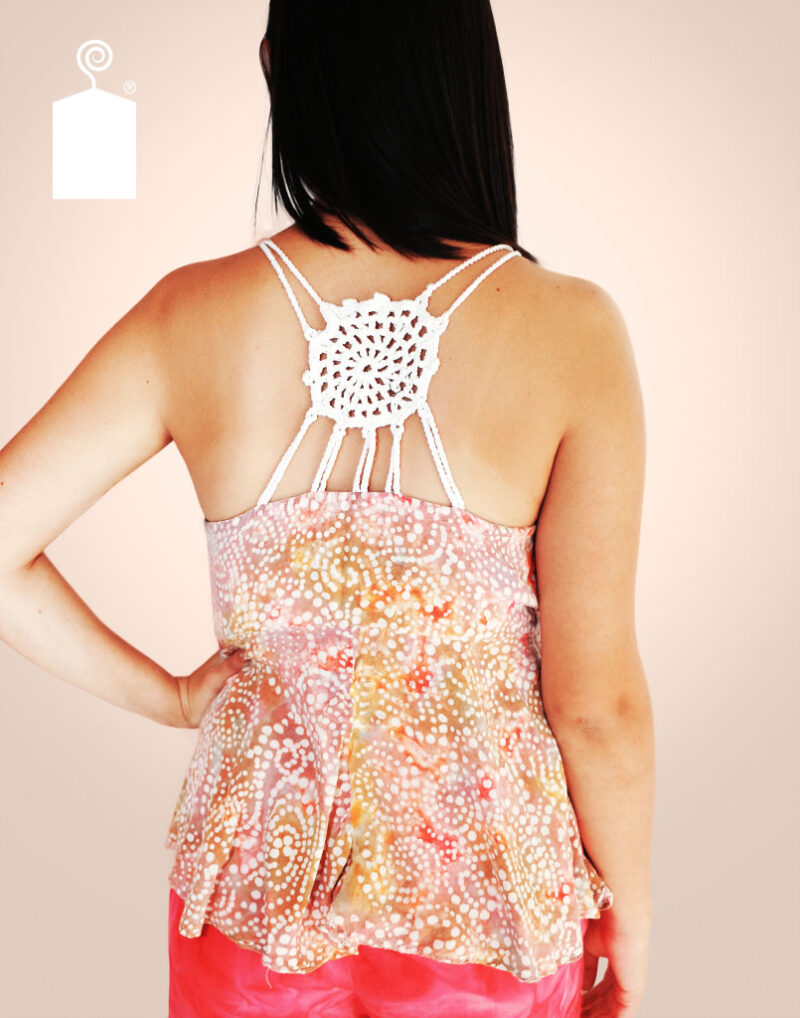 Blusa playera estampada con espiral blanca central en la espalda elaborada a mano en técnica ganchillo.Tiras hacia el frente en ganchillo y ajuste al busto con elástico.